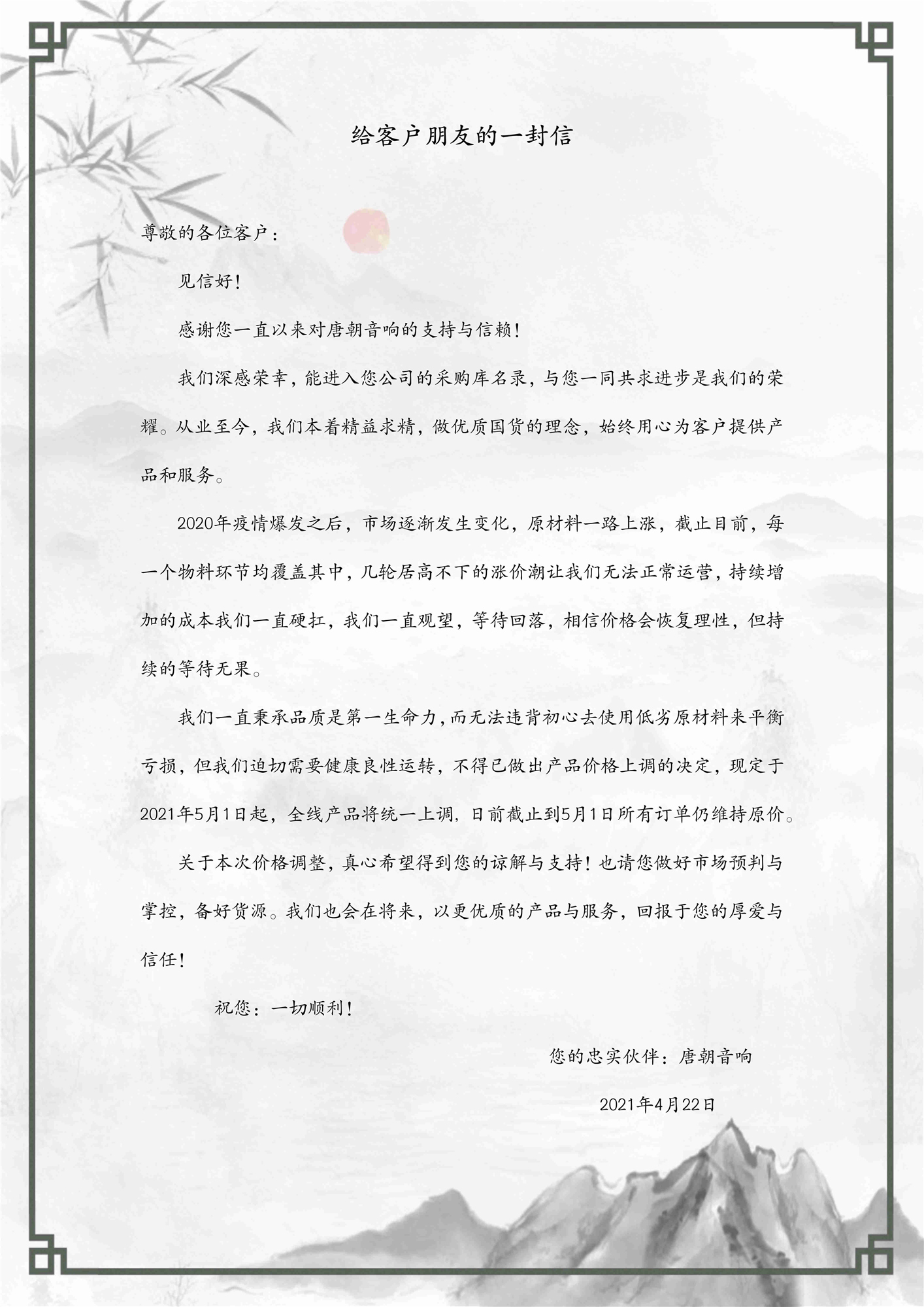 【唐朝资讯】给客户朋友的一封信