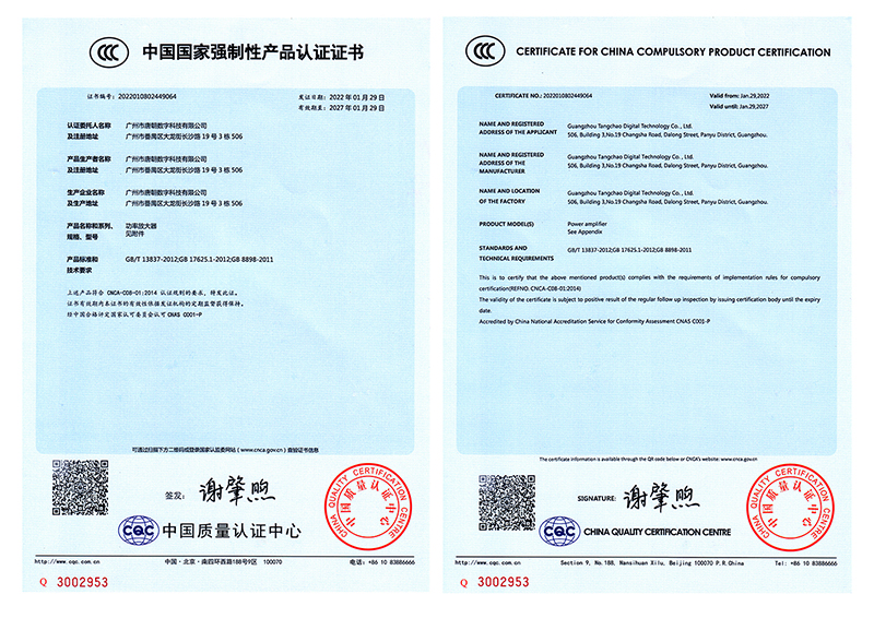 由此可见,3C产品认证顺利通过标志着我公司功率放大器达到了国家3C标准要求,这是中国质量认证中心对我公司技术实力和产品品质的肯定,更是我公司又一重要认证,标志着我们更加关注产品,关注客户,关注服务。通过此次认证,我们将更严格从源头把控品牌产品质量,同时为产品品质的提升注入了一剂“强心针”。